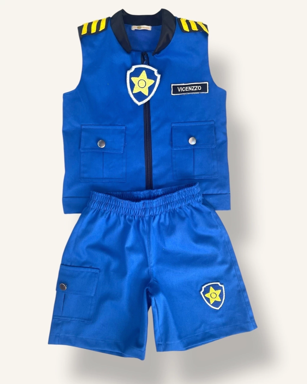 - Colete, Cap e short em Sarja Azul Royal e detalhes em preto, bordado computadorizado e zíper destacável.